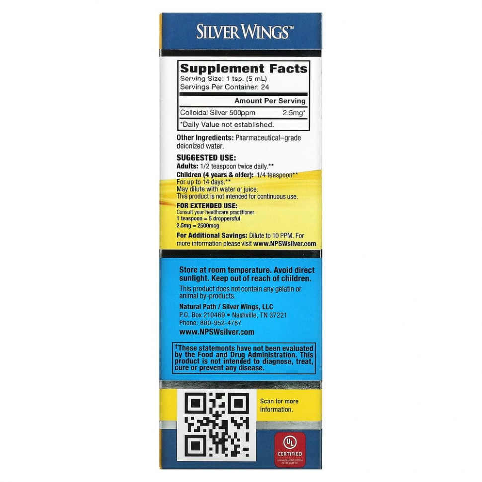 Значение, измеряемое в ч/млн (части на миллион), соответствует количеству серебра в одной порции. 50, 150, 250 и 500 частей на миллион — уровни силы действия. Для получения суточной дозы при использовании формул 10 ч/млн может потребоваться многократный прием препарата. 1 чайная ложка Silver Wings в концентрации 500 ч/млн равна 50 чайным ложкам раствора, содержащего 10 ч/млн.