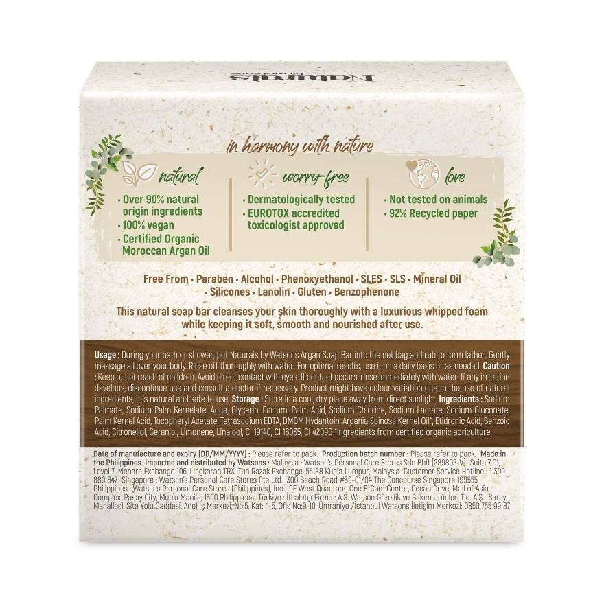 This Naturals by Watsons Argan Soap Bar with soap net included cleanses your skin thoroughly with a luxurious whipped foam while keeping it soft, smooth and nourished after use. Our product is formulated with over 90 natural origin ingredients and is 100 vegan. It contains Certified Organic Moroccan Argan Oil. Our formula is dermatologically tested, EUROTOX accredited toxicologist approved. Ingredient you can trust with a reduced environmental impact. This product was formulated without over 20 unwanted ingredients. Additionally, the paper used in this packaging is made with 92 recycled paper.