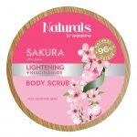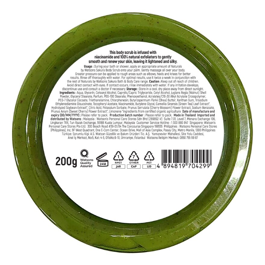 NATURALS BY WATSONS SAKURA LIGHTENING BODY SCRUB This body scrub is infused with niacinamide and 100% natural exfoliators to gently smooth and renew your skin, leaving it lightened and silky. Harmonising Nature With Science. (NATURAL) 96% natural origin ingredients. 100% Vegan.(WORRY-FREE) Dermatologically tested. EUROTOX accredited toxicologist approved.(LOVE) 100% Recycled Ocean Bound Plastic Jar. Manufactured under ISO 14001.Ingredient you can trust with a reduced environmental impact. This product was formulated without over 20 unwanted ingredients.Additionally, the jar is also made with 100%Recycled Ocean Bound Plastic.