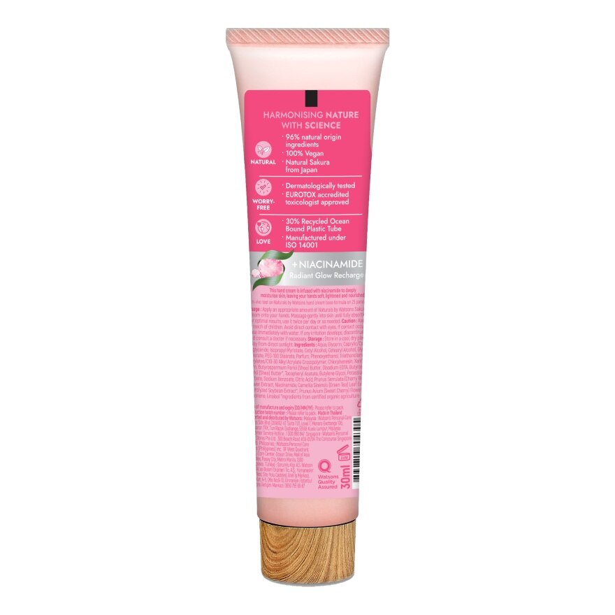 NATURALS BY WATSONS SAKURA LIGHTENING HAND CREAM Harmonising Nature With Science ( NATURAL) 96% natural origin ingredients. 100% Vegan Natural Sakura from Japan.(WORRY-FREE) Dermatologically tested. EUROTOX accredited toxicologist approved. (LOVE) Manufactured under ISO 14001. Niacinamide Radiant Glow Recharge. This hand cream is infused with niacinamide to deeply moisturise skin, leaving your hands soft,lightened and nourished.Ingredient you can trust with a reduced environmental impact. This product was formulated without over 20 unwanted ingredients.Additionally, the tube is also made with 30%Recycled Ocean Bound Plastic.