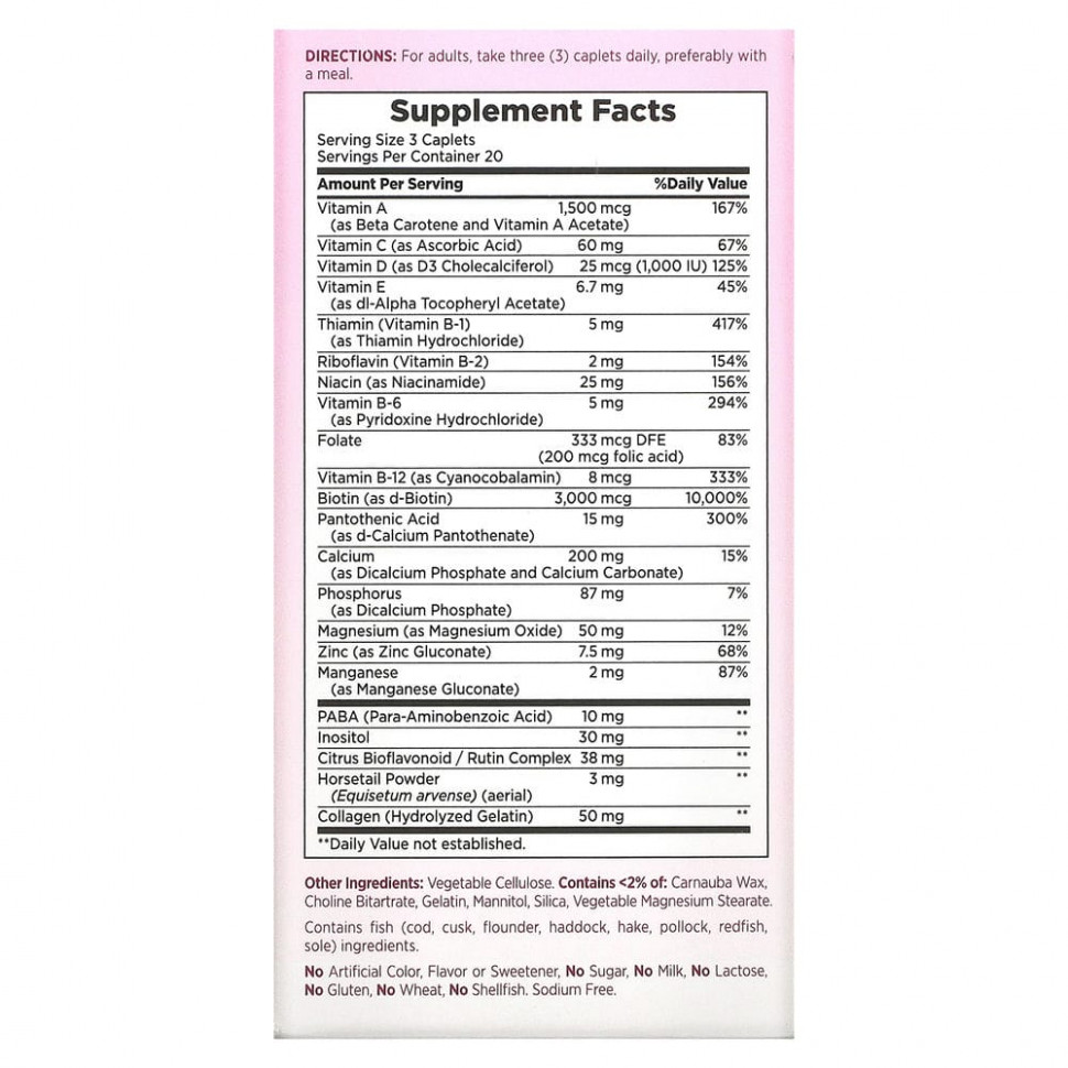 Эта инновационная формула обеспечивает жизненно важные питательные вещества, необходимые вашему организму для поддержания вашей естественной красоты изнутри. Витамины группы В способствуют энергетическому обмену, а биотин помогает поддерживать здоровье волос и ногтей. Витамин E и витамин C относятся к антиоксидантам. Витамин C участвует в производстве и формировании коллагена, основного фактора, способствующего сияющему виду кожи. Витамин A полезен для поддержания здоровья кожи и организма в целом.