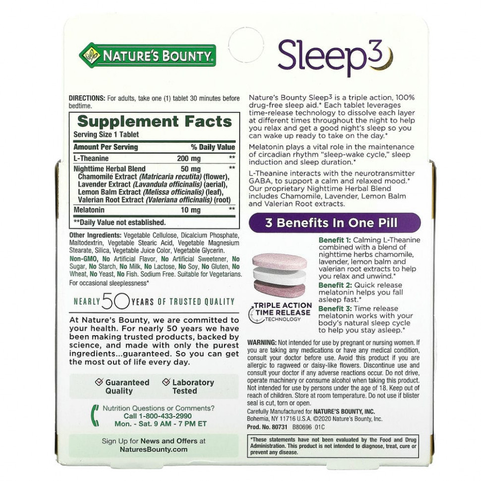 Sleep3 от Nature’s Bounty — это средство для нормализации сна тройного действия, не содержащее наркотических веществ. Благодаря технологии медленного высвобождения каждый слой таблетки растворяется отдельно в течение всей ночи, способствуя расслаблению и нормальному ночному сну, после которого вы просыпаетесь отдохнувшим и готовым к новому дню.