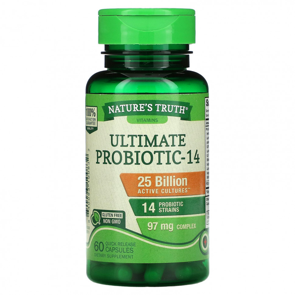 ** Пробиотик-14 Nature’s Truth® Ultimate содержит более 25 миллиардов активных культур в одной порции (включая натуральные продукты метаболизма, вырабатываемые лактобактериями) на момент производства.