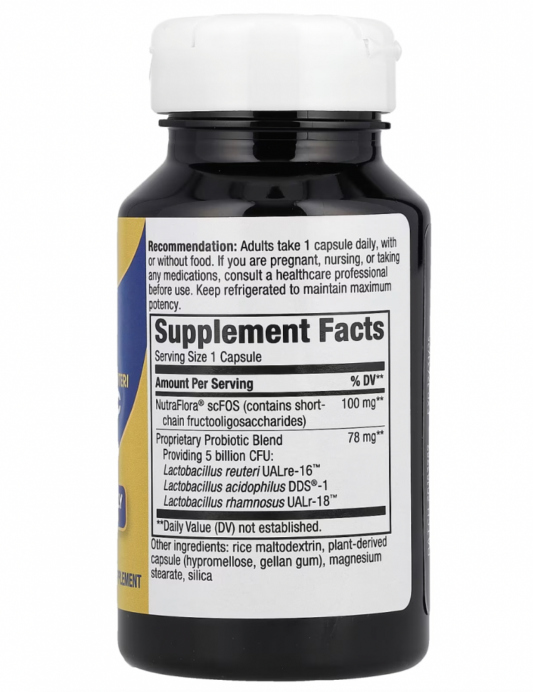 Реутери от Primadophilus — это пробиотик, в состав которого входят несколько штаммов: лактобактерии реутери (L. reuteri) (UALre-16™), ацидофильные лактобактерии (L. acidophilus) и лактобактерии рамнозус (L. rhamnosus). Эта добавка