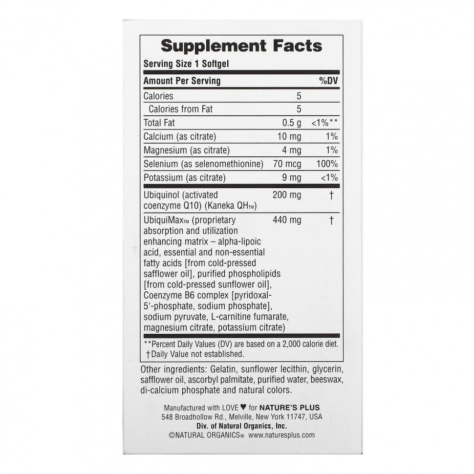 Добавка Nature’s Plus Beyond CoQ10 содержит 200 мг убихинола фармацевтической степени чистоты (самой высокой в мире), который является наиболее усваиваемой формой коэнзима Q10. Beyond CoQ10 — это единственная в мире добавка с коэнзимом Q10, который дополнен формулой UbiquiMax™ для повышения его биодоступности и эффективности усвоения. Минералы комплекса UbiquiMax оптимизируют усвоение убихинола, поддерживая формирование мицелл — микроскопических структурных элементов питательных веществ, которые необходимы для проникновения через стенки кишечного тракта. Кофакторы (альфа-липоевая кислота, пируват, пиридоксаль-5-фосфат (P5P) и L-карнитин) оптимизируют использование убихинола, поддерживая активность ферментных антиоксидантов и эффективную выработку энергии в цикле Кребса.