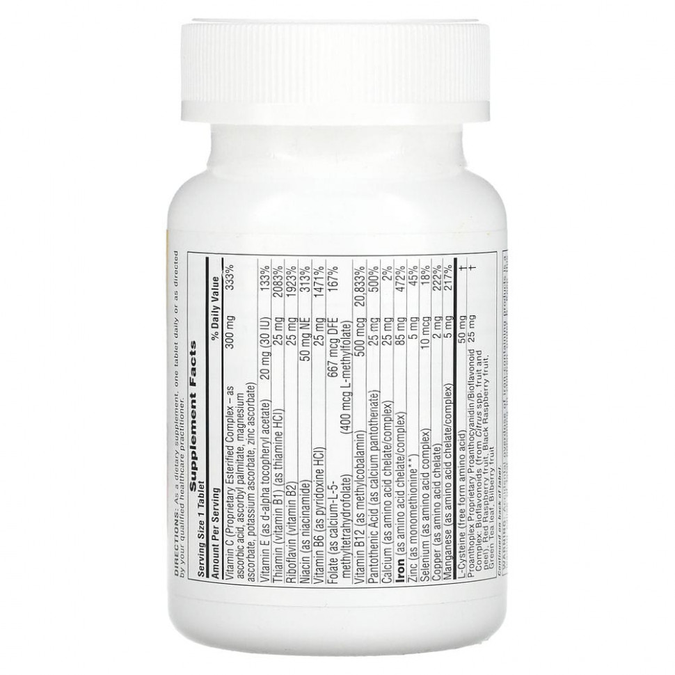 Витамин C (запатентованный эстерифицированный комплекс в виде аскорбиновой кислоты, аскорбил пальмитата, аскорбата магния, аскорбата калия, аскорбата цинка) | 300 мг | 333% |