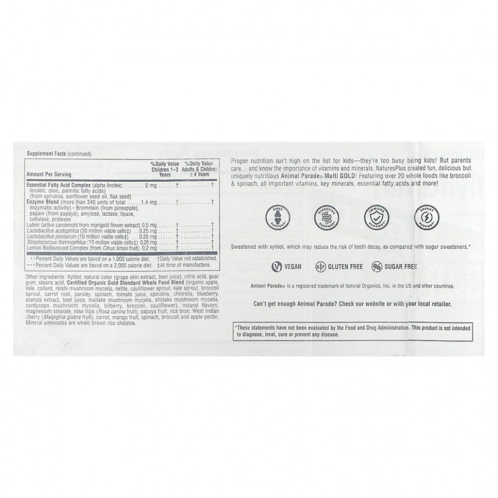 Жевательные мультивитамины без сахара Animal Parade® Gold для детей выводят на новый уровень этот популярный состав с мультивитаминами и микроэлементами! Насыщенная невероятно аппетитным натуральным вкусом винограда, каждая порция этого забавного жевательного продукта в форме животных теперь содержит 500 МЕ витамина D3, повышенную дозу микроэлементов, ферментов, пробиотиков и множество натуральных цельных продуктов.