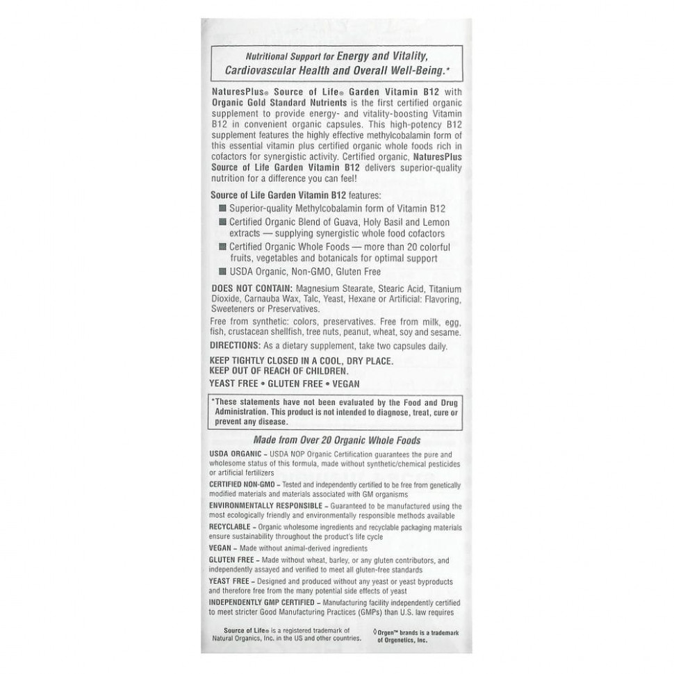 Витамин В12 от Nature’s Plus Source of Life Garden с набором нутриентов, соответствующим органическому золотому стандарту — это первая сертифицированная органическая пищевая добавка, содержащая придающий энергию и жизненные силы витамин В12 в удобных органических капсулах. Этот органический витамин B12 представляет собой метилкобаламин — высокоэффективную форму этого жизненно важного витамина с добавлением сертифицированных органических натуральных продуктов, богатых кофакторами, усиливающими его действие. Витамин В12 от Nature’s Plus Source of Life Garden является сертифицированным органическим продуктом и содержит высококачественные питательные вещества, с которыми вы обязательно почувствуете разницу!