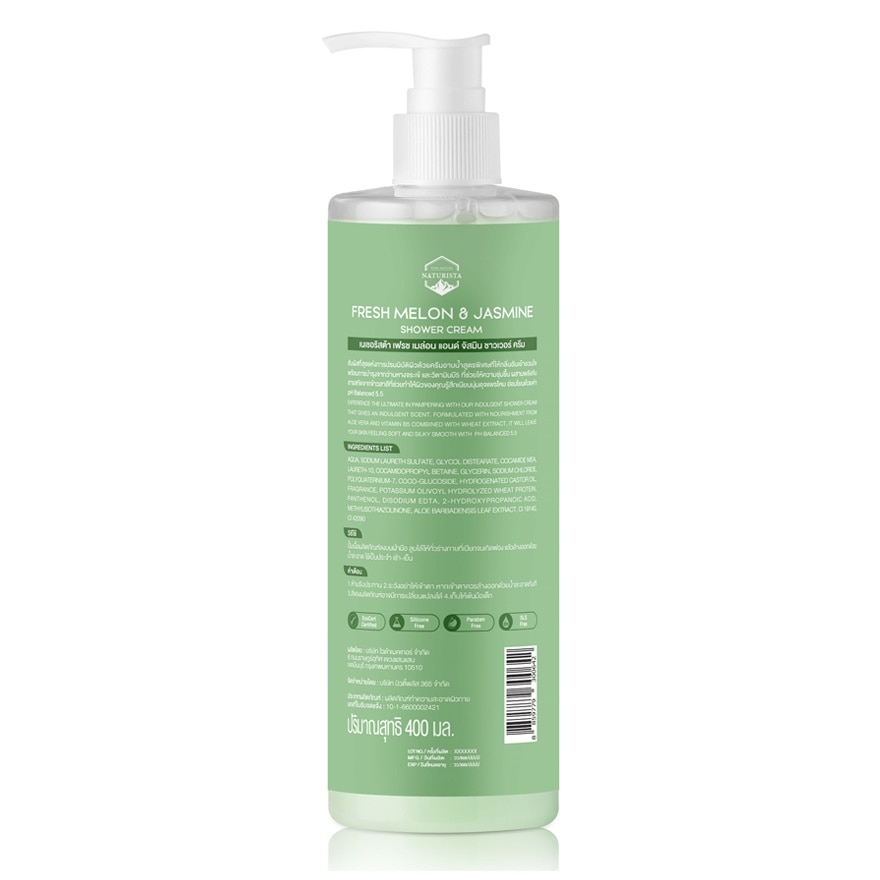 Naturista Fresh melon & Jasmine Shower Cream Melon scented shower cream Add long lasting freshness. Experience the ultimate in pampering your skin with a specially formulated shower cream that gives off an alluring scent. With nourishment from aloe vera. and vitamin B5 that helps moisturize Combined with wheat extract to help make your skin feel smooth and soft like silk.