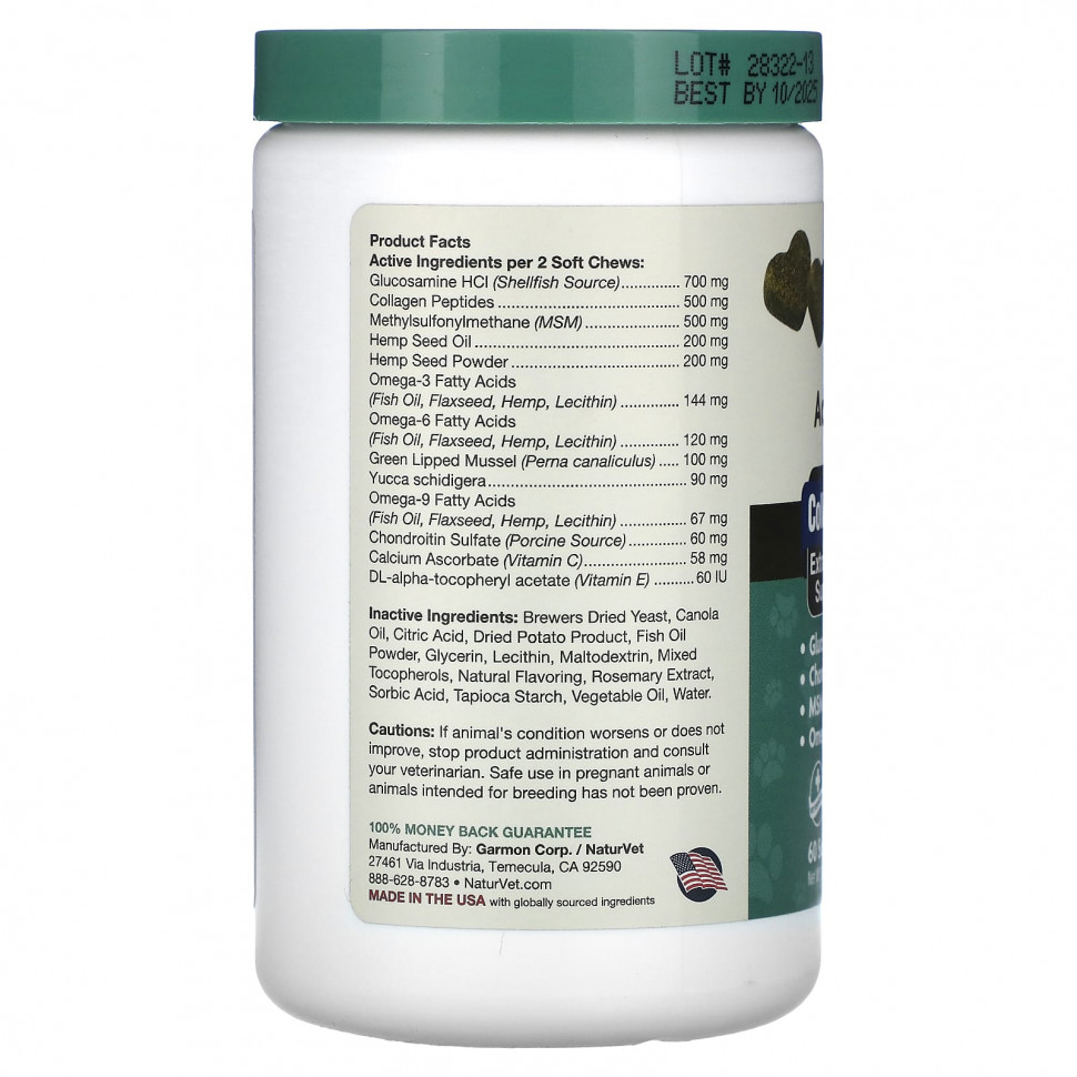Разработано ветеринаром и рекомендовано для собак старше 12 недель. Содержит синергетическую смесь глюкозамина, коллагена, хондроитина, МСМ, конопляного масла и жирных кислот омега. Коллаген обеспечивает дополнительную поддержку суставов и дополняет оптимальную смесь для улучшения нормального восстановления соединительной ткани и суставов. Помогает поддерживать нормальную эластичность соединительных тканей, таких как хрящи, сухожилия и связки, помогая поддерживать здоровье бедер и суставов. Может помочь снять воспаление, связанное с обычными ежедневными упражнениями и физической активностью.
