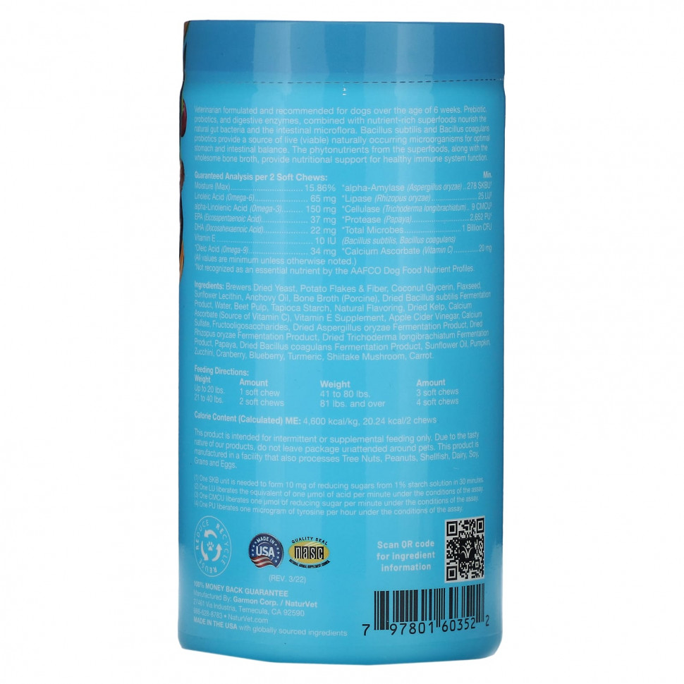 Разработано ветеринаром и рекомендовано для собак старше 6 недель. Пребиотики, пробиотики и пищеварительные ферменты в сочетании с богатыми питательными веществами суперпродуктами питают естественные кишечные бактерии и кишечную микрофлору. Bacillus subtilis и Bacillus coagulans являются источником живых (жизнеспособных) естественных микроорганизмов для оптимального баланса желудка и кишечника. Фитонутриенты из суперфудов, а также полезный костный бульон обеспечивают питательную поддержку здоровой функции иммунной системы.