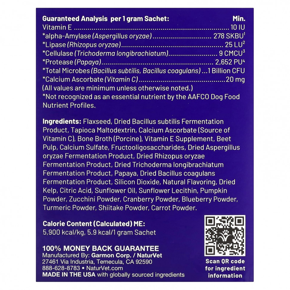 семена льна, продукт ферментации сушеной палочки (Bacillus subtilis), мальтодекстрин из тапиоки, аскорбат кальция (источник витамина C), костный бульон (свиной), добавленный витамин Е, свекольный жом, сульфат кальция, фруктоолигосахариды, сухой продукт ферментации аспергилла (Aspergillus oryzae), продукт ферментации сушеного ризопа (Rhizopus oryzae), сухой продукт ферментации триходермы (Trichoderma longibrachiatum), папайя, сухой продукт ферментации бактерий бациллус коагуланс (B. coagulans), диоксид кремния, натуральный ароматизатор, сушеные водоросли, лимонная кислота, подсолнечное масло, подсолнечный лецитин, тыквенный порошок, порошок из кабачков, порошок из клюквы, порошок из голубики, куркума, порошок шиитаке, морковный порошок.