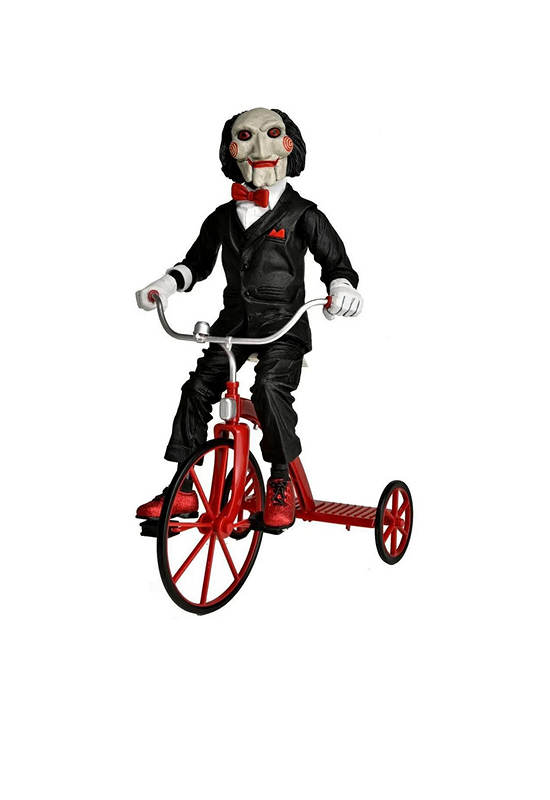 Billy is back! In the Saw movies, The Jigsaw Killer abducts the morally wayward in a twisted attempt to teach his victims the value of life. Once captured, his prisoners must face impossible choices in a horrific game of survival as he communicates with them through an eerie puppet. This 12” action figure of Billy the Puppet on Tricycle from NECA features new paint deco and closed box packaging. Press a button to hear sound from the movie! Batteries included.