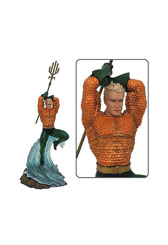 How deep is your gallery? the DC gallery line of PVC dioramas now adds the King of Atlantis, Aquaman! springing from the sea with his trident poised to attack, Arthur Curry is the subject of this 9-inch-scale diorama, wearing his classic orange-and-green outfit.