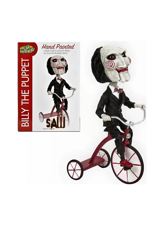 Billy is back! Returning to NECA’s popular Head Knockers line is the iconic puppet from Saw. The horror movie series uses this tricycling terror to great effect, but here his bobbling head makes him almost cute. Almost. Made of hand-painted resin, this Head Knocker is 8″ tall and comes in collectible matte-finish packaging with spot gloss. The fan of this movie shouldn’t miss it.