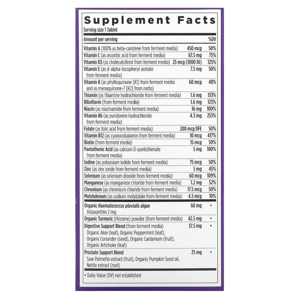 Продукт разработан экспертами для комплексной поддержки здоровья мужчин старше 55 лет. Содержит питательные вещества для поддержки здоровой функции мозга, здорового зрения, прочности костей, здоровья предстательной железы, для защиты от стресса и поддержки хорошего настроения, для поддержки зрительной и пищеварительной систем, а также здоровья волос, кожи и ногтей. Не содержит железа.