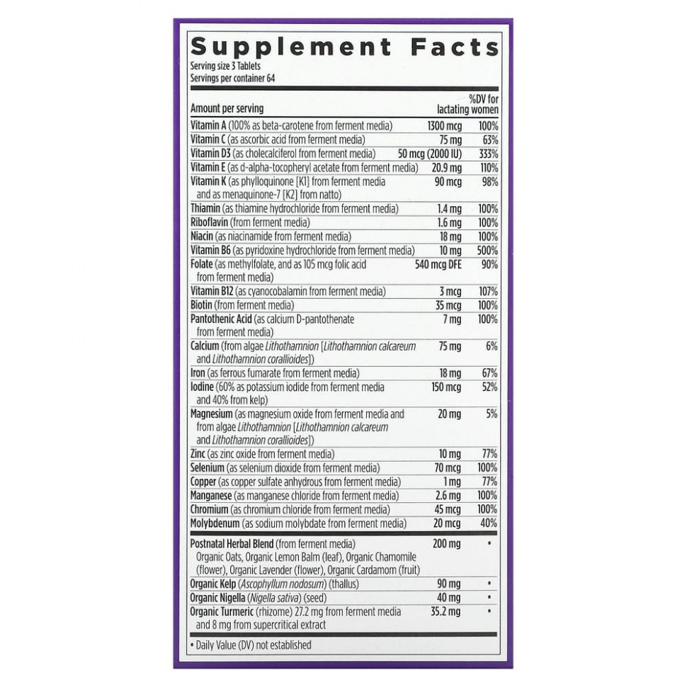 Питательные вещества для грудного молока. Формула содержит витамины и минералы, рекомендованные для кормящих женщин, в том числе ферментированное железо, не вызывающее запоров, а также ферментированный витамин B6, йод и витамин D3.