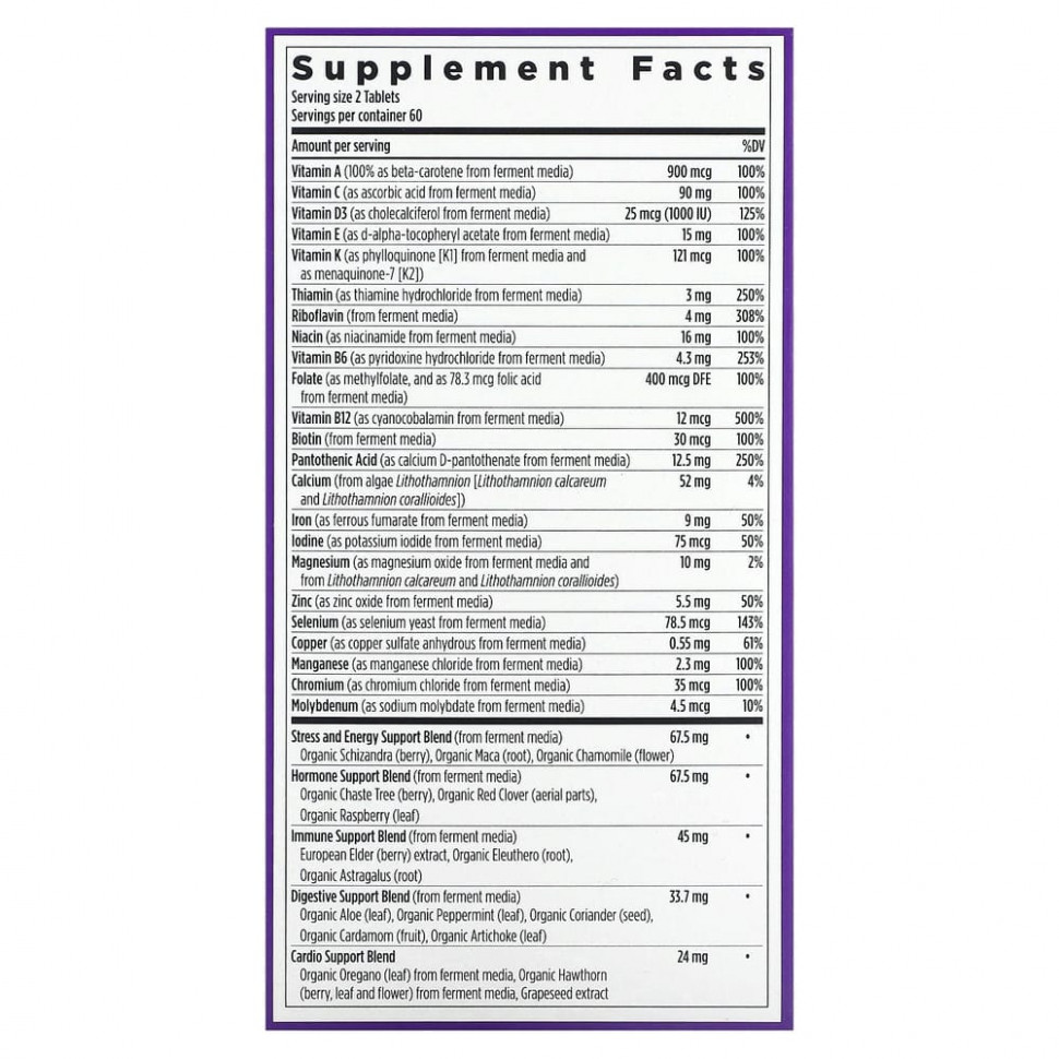 Комплексный состав для поддержания общего женского здоровья, а также удовлетворения особых потребностей организма с помощью питательных веществ для сердца, мозга, зрения, костей и груди. Добавка также помогает повысить стрессоустойчивость организма и поддерживать здоровое пищеварение с помощью всего лишь 2 таблеток в день.