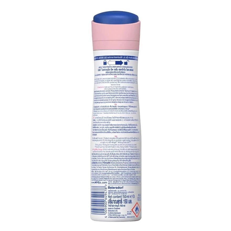 Nivea Brightening Deep Serum Hokkaido Rose Spray NIVEA Deodorant Spray Serum formula for long lasting odor protection and brightening effect. Enriched with concentrated vitamin C and natural hokkaido rose extract. It deeply nourishes to repair, brighten skin and tighten pores noticeably. Long lasting elegant lily scent. Effective 48 hr. protection. Skin tolerance dermatologically proven. Alcohol Denat. Naturally brighten. Cosmetics can not change skin color. Result depends on individual skin tone and condition.