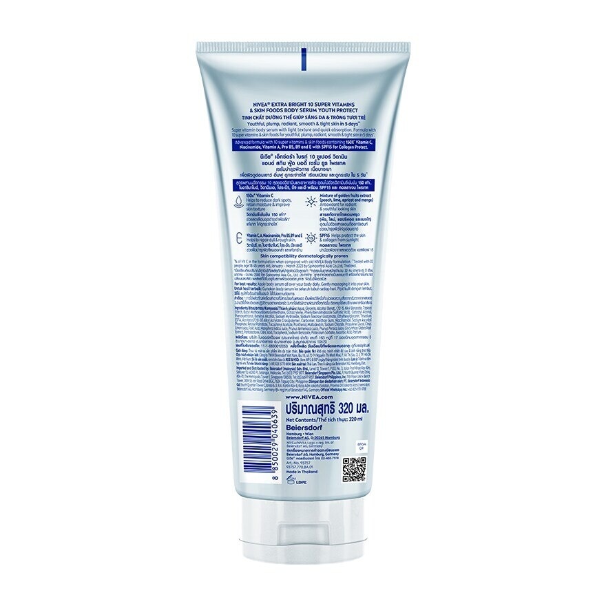Nivea Extra Bright 10 Super Vitamins amp; Skin Foods Body Serum Youth Protect Youthful plump radiant smooth and tight skin in 5 days Super vitamin body serum with light texture and quick absorption. Formula with 10 super vitamins and skin foods for youthful plump radiant smooth and tight skin in 5 days Advanced formula with 10 super vitamins and skin foods containing 150X Vitamin C Niacinamide Vitamin A Pro B5 B9 and E with SPF15 for Collagen Protect.