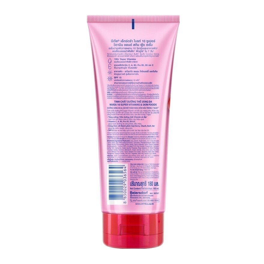 Nivea Extra Bright 10 Super Vitamins Skin Foods Serum SPF15 To brighten skin reduce stubborn dark spots in 7 days 100x Super Vitamins Formula visibly reduces stubborn dark spot Formula with Vitamin C, A, B3, Pro B5, B9 and E Helps to repair and brighten skin Formula with Lemon, Goji Berry, Pomegranate and Avocado Brightens, nourishes and smooths skin SPF 15 Protects from sunlight2 To brighten skin reduce stubborn dark spots in 7 days Apply lotion daily all over your body Massage it into your skin, nice and gentle. Benefits