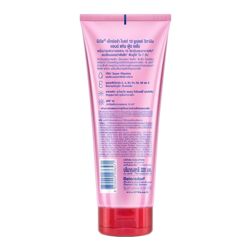 Nivea Extra Bright 10 Super Vitamins Skin Foods Serum SPF15 To brighten skin reduce stubborn dark spots in 7 days 100x Super Vitamins Formula visibly reduces stubborn dark spot Formula with Vitamin C, A, B3, Pro B5, B9 and E Helps to repair and brighten skin Formula with Lemon, Goji Berry, Pomegranate and Avocado Brightens, nourishes and smooths skin SPF 15 Protects from sunlight2 To brighten skin reduce stubborn dark spots in 7 days Apply lotion daily all over your body Massage it into your skin, nice and gentle. Benefits