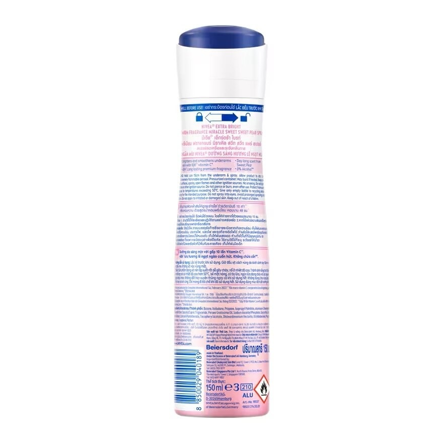 NIVEA EXTRA BRIGHT PREMIUM FRAGRANCE MIRACLE SWEET SWEET PEAR SPRAY Brightens and smoothens underarms skin with 10X vitamin C 48H Long lasting premium fragrance Day long sweet scent from lily of the valley 0% Alcohol In vitro test conducted by Givaudan International SA February 2022 10x more vitamin C compared to Extra Brightening Spray Vitamin C deritative Ethyl Alcohol. Directions Hold can 15cm from the underarms & spray. Allow product to dry completely. Brightens and smoothens underarms skin with 10X vitamin C 48H Long lasting premium fragrance.