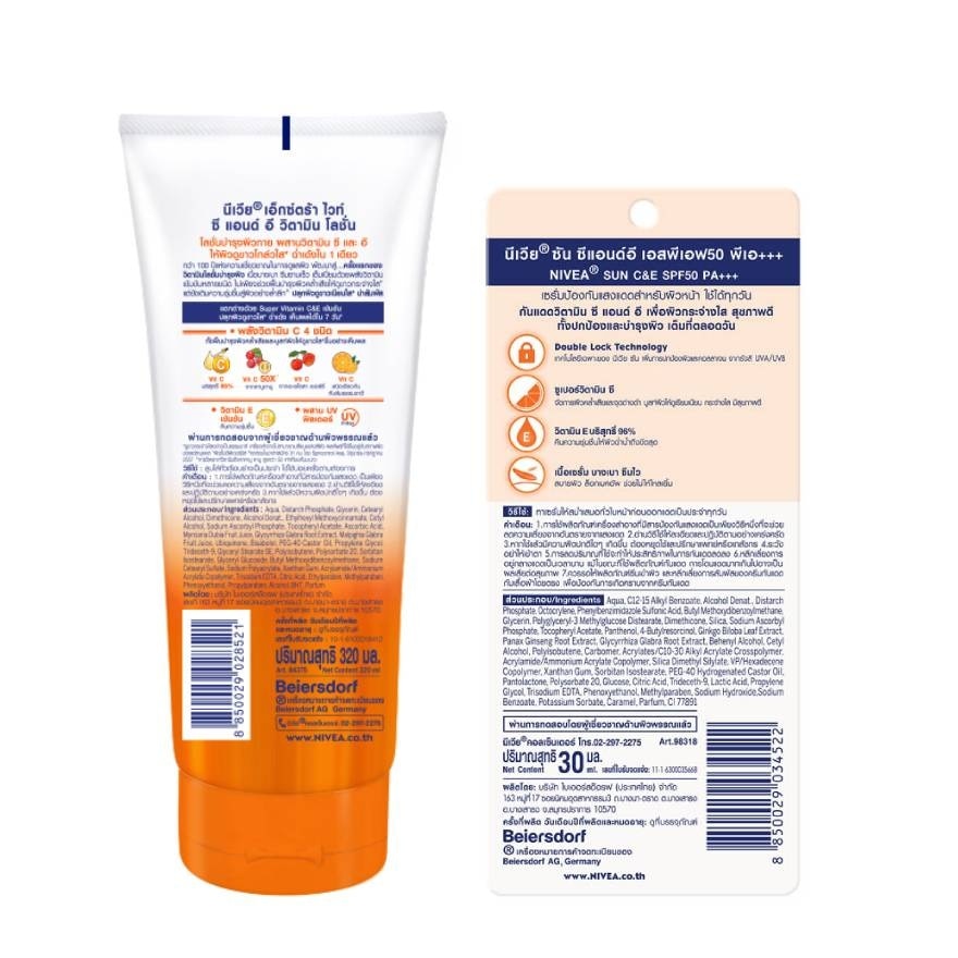 Nivea Sun Body Vitamin C SPF50 PA+++ Sun Screen Serum with 50X vitamin C for intensive brightening. The light and absorb-in-second formula comes with NIVEA own technology that protect skin and collagen from UVA/ UVB. The concentrated 50X+ vitamin C extracted from Camu Camu gives skin glow naturally and doesn’t cause thinner and sensitive skin like BHA. The well designed texture being light, fast absorbing give you skin comfort for your daily usage. With 50X of Camu Camu Extract (Vitamin C), in comparison to lemon extract Look naturally radiant, the result depends on the individual skin condition. 1 Vitamin C from Myrciaria Dubia Fruit Juice, Malpighia Glabra Fruit Juice and Ascorbic acid (same type of Vitamin C that found in natural orange).