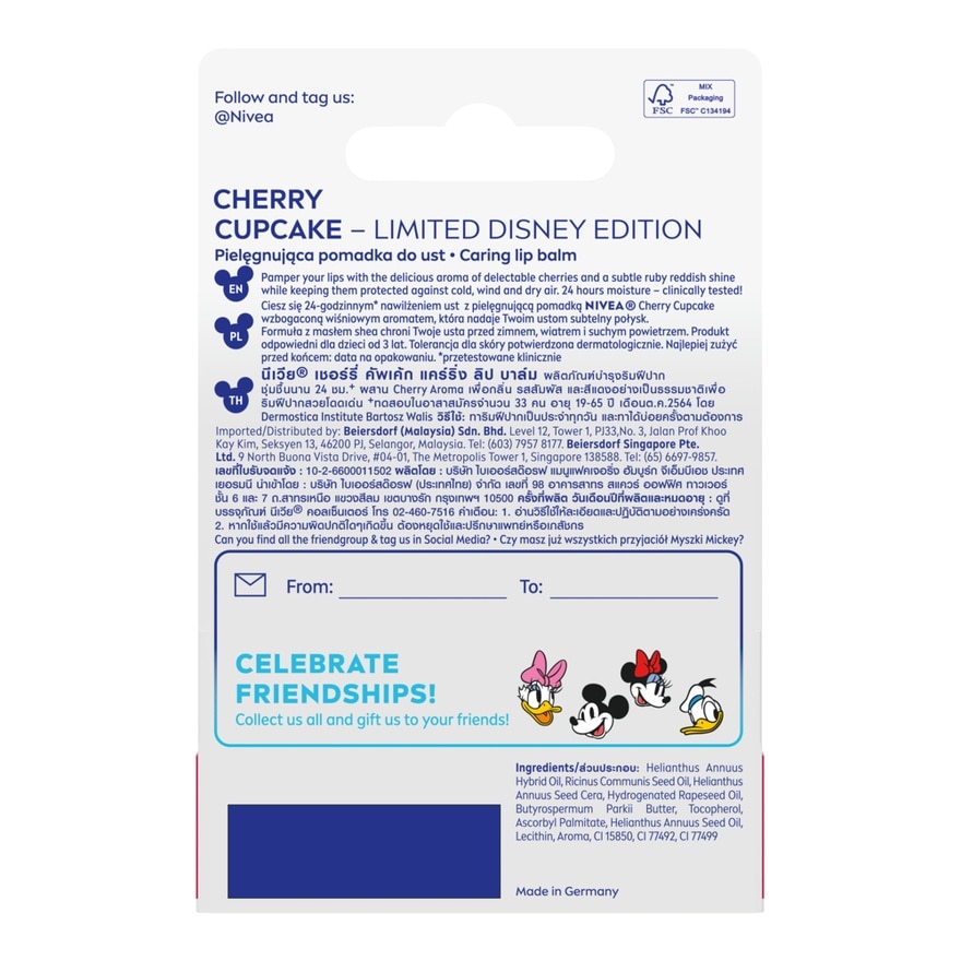 Nivea Cherry Cupcake Caring Lip Balm Limited Disney Edition Pamper your lips with the delicious aroma of delectable cherries and a subtle ruby reddish shine while keeping them protected against cold, wind and dry air. 24 hours moisture — clinically tested. Apply on Lip Suitable for daily used. — NIVEA CHERRY CUPCAKE CARING LIP BALM LIMITED DISNEY EDITION — Pamper your lips with the delicious aroma of delectable cherries and a subtle ruby reddish shine while keeping them protected against cold, wind and dry air. 24 hours moisture. — Tested on 33 volunteers aged 19-65 years, October 2021 by Dermostica Institute BartoszWalis.