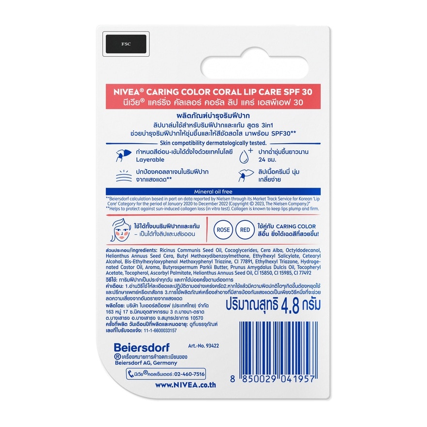 NIVEA CARING COLOR CORAL LIP CARE SPF 30 Color Lip & Cheek Balm SPF 30 Our buttery 3in1 formula for lips and cheeks delivers an intense color without drying out, provides 24 hr. moisture and helps to protect against collagen loss thanks to sun protection with SPF 30 Pro Tip CARING COLOR shades are layer able-combine them to create additional unique shades. — Buildable color from soft to intense — Long-lasting moisture for soft & smooth lips — Helps to protect against collagen loss — Creamy texture & easy application -Beiersdorf calculation based in part on data reported by Nielsen through its Market Track Service for Korean Lip Care Category for the period of January 2020 to December 2022 (Copyright 2023, The Nielsen Company.) -Helps to protect against sun-induced collagen loss (in vitro test). Collagen is known to keep lips plump and firm.