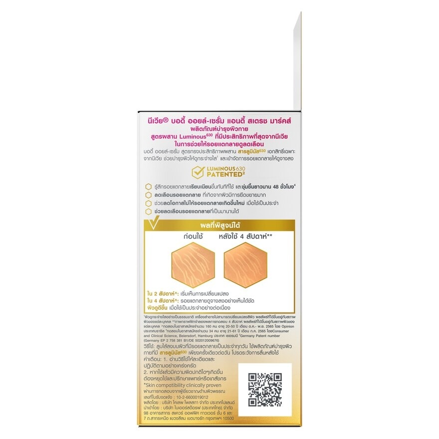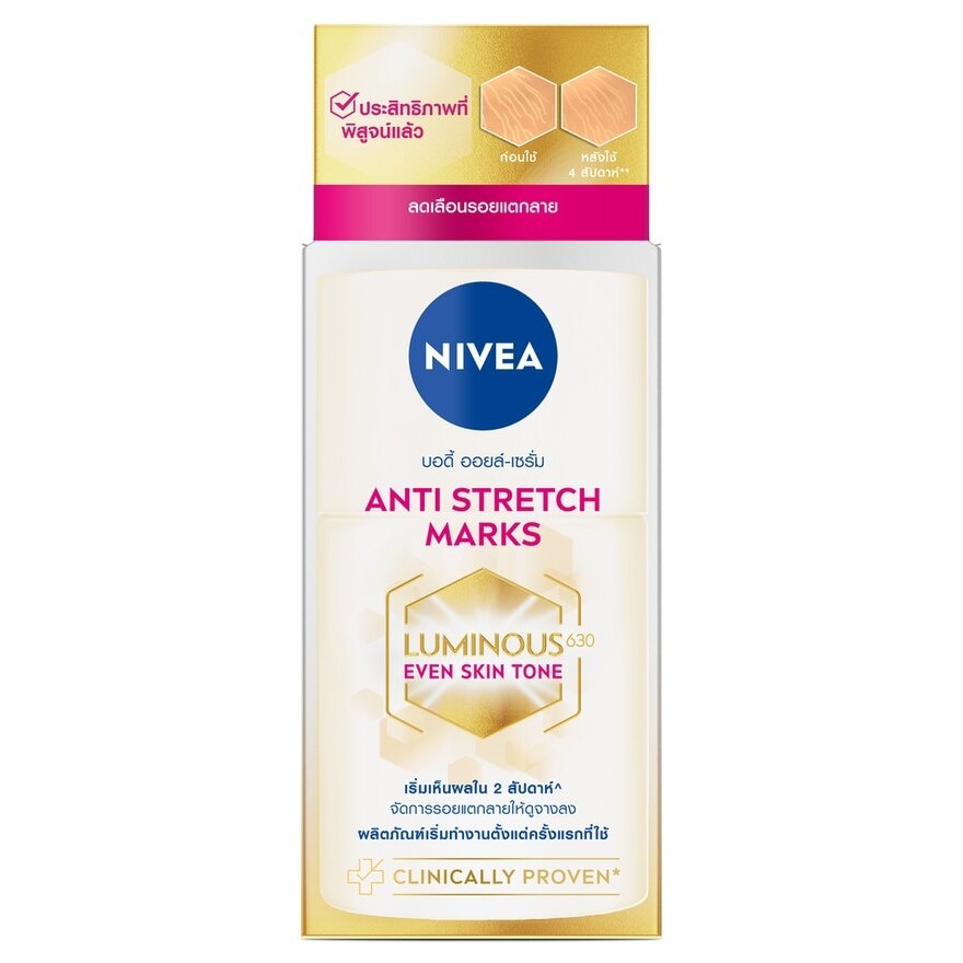 Nivea Luminous 630 Body Oil-Serum Anti Stretch Marks NIVEA’SHIGHEST EFFICACY IN REDUCING STRETCH MARKS VISIBILITY The highly effective oil-serum with the skin-tone-balancing formula featuring patented LUMINOUS630 active ingredient, evens out the skin tone to significantly reduce stretch marks appearance. First visible results in 2 weeks Significantly reduces stretch marks appearance Starts working from day 1 — Instant smooth skin feel on stretch marks & 48h moisture — Visibly reduces stretch mark appearance — Helps prevent new stretch marks with regular pinch massage.