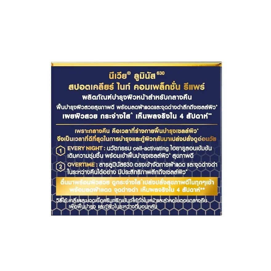 Nivea Luminous 630 Spot Clear Night Complexion Repair Revitalize and recharges skin overnight while reducing melasma and dark spots at cellular level. Visible results in 4 weeks Reveal beautiful heatlhy and radiant skin every morning Restore skin complexion night after night with 2 actions