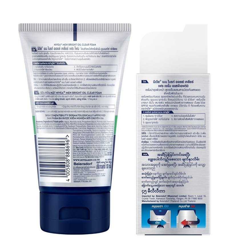 Nivea Men Bright Oil Clear Face Foam Deeply cleanses and instantly cools down the skin to remove excess oil for an all day oil-free and bright skin. Effective formula with AIRCOOL deeply cleanses the skin, intantly cooling down the skin's trapped heat to remove excess oil, leaving only a refreshed, oil-free and bright looking skin.