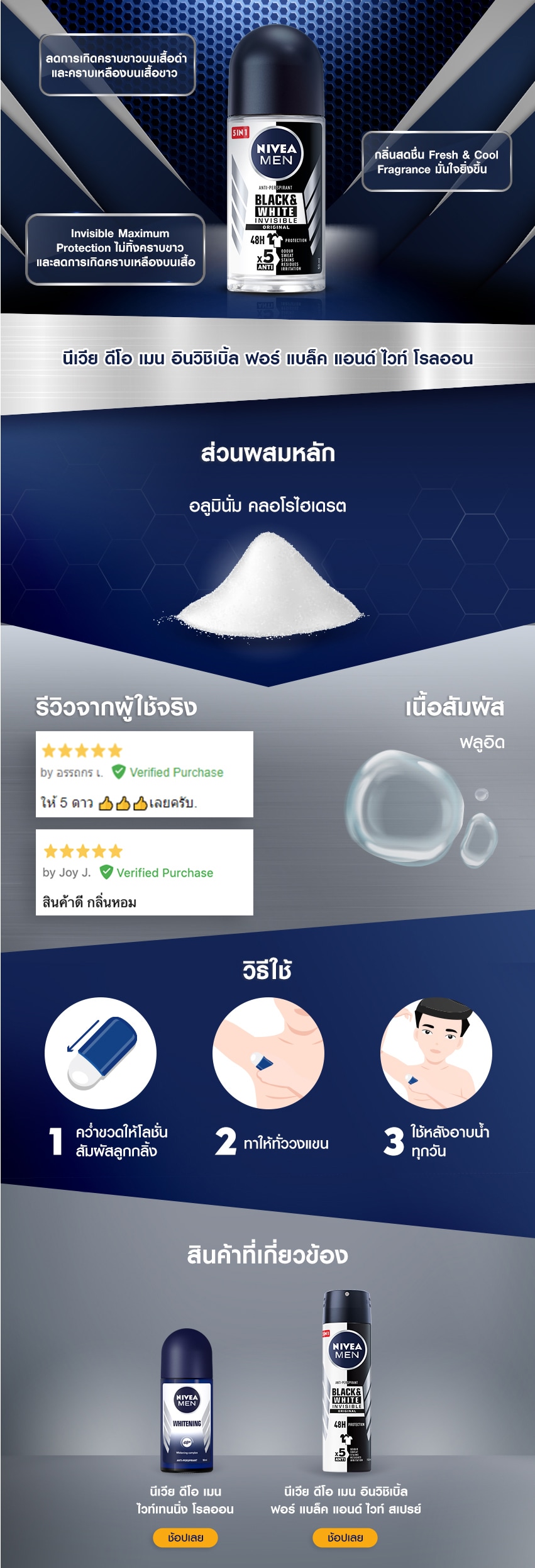 Nivea Men Roll On Black & White Invisible Roll On No white marks on black clothing & anti yellow staining on white clothing. NIVEA MEN Invisible Black & White Original Anti-Perspirant Roll-on Deodorant offers powerful anti-perspirant protection without the risks of white marks on black clothing and yellow stains on white clothing. By using anti-stain technology, NIVEA MEN Black & White is able to protect the textile fibres before stain components can reach and penetrate them. The unique formula protects you for 48 hours against perspiration while gently caring for your skin in the process. Say Goodbye to white and yellow stains on your clothes and get the reliable protection and care that you deserve! The roll on anti perspirant is great for men on the go. The skin tolerance of this anti-perspirant has been dermatologically proven.