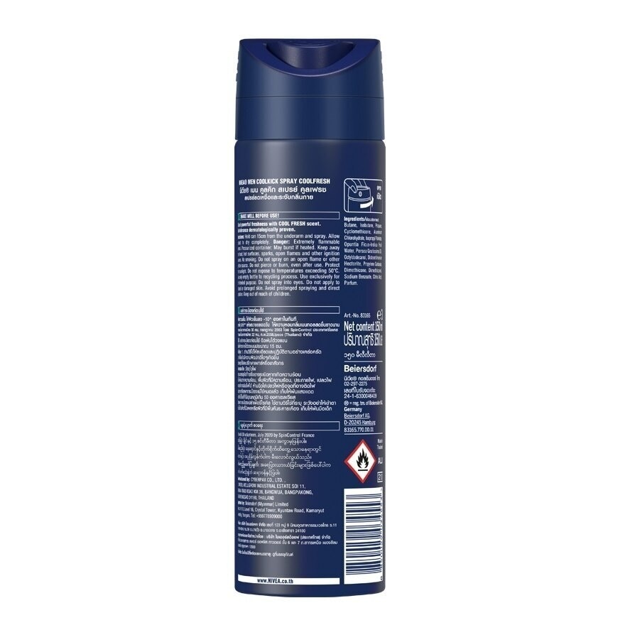 Nivea Men Spray Coolkick Cool Fresh Kick of invigorating freshness with COOL FRESH scent Instantly decrease skin tempurature by -10C. 3X Extra dry feeling. Long lasting fragrance.No ethyl alcohol Skin tolerance dermatologically proven. SpinControl, France , July 2020 Ipsos, Thailand, Feb 2015