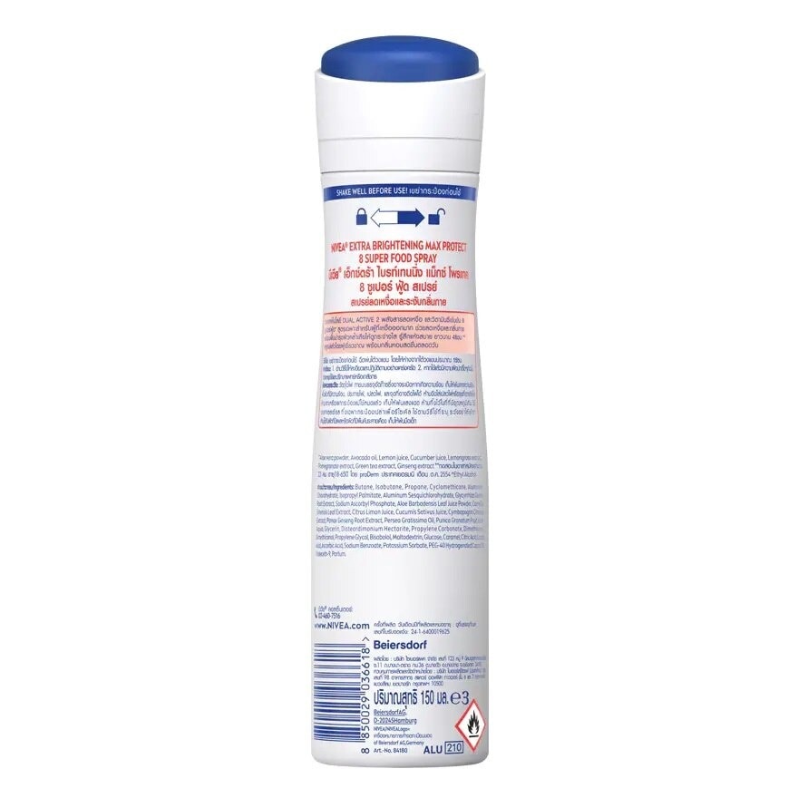 Nivea Spray Extra Brightening Max Protect Formulated for heavy sweat individuals. With Dual Active Technology and vitamin C from 8 superfood effectively reduce sweat and odor, while repair and brighten dull skin. Lasting dryness 48hrs. with refreshing scent all-day long. Proven by skin experts. 0% Alcohol Hold can 15cm. from the underarm and spray. Allow product to dry completely. Aloe vera powder, Avocado oil, Lemon juice, Cucumber juice, Lemongrass extract, Pomegranate extract, Green tea extract, Ginseng extract Tested in 23 people, proDerm Germany, Oct 2011 Ethyl Alcohol.