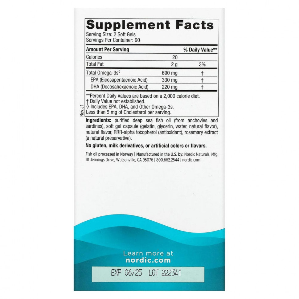 «Омега-3» от компании Nordic Naturals содержит 690 мг омега-3 жирных кислот на порцию, что намного превышает рекомендованную экспертами дозировку (500 мг в день). Прием достаточного количества омега-3 обеспечивает качественное питание и улучшение общего самочувствия, в том числе улучшение работы сердца и мозга. Кроме того, повышается настроение, улучшаются когнитивные функции и укрепляется иммунитет.