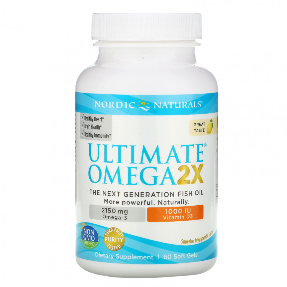 Наш самый действенный жир. Ultimate Omega 2X с витамином D3 содержит рыбий жир омега-3 высочайшей концентрации в форме триглицеридов (форма, естественным образом присутствующая в рыбе), что обеспечивает отличное усвоение и максимальную пользу. Каждая капсула содержит высокоэффективную комбинацию 1000 мг ЭПК и ДГК и 500 МЕ витамина D3, которая удовлетворяет целому комплексу потребностей организма в питательных веществах.