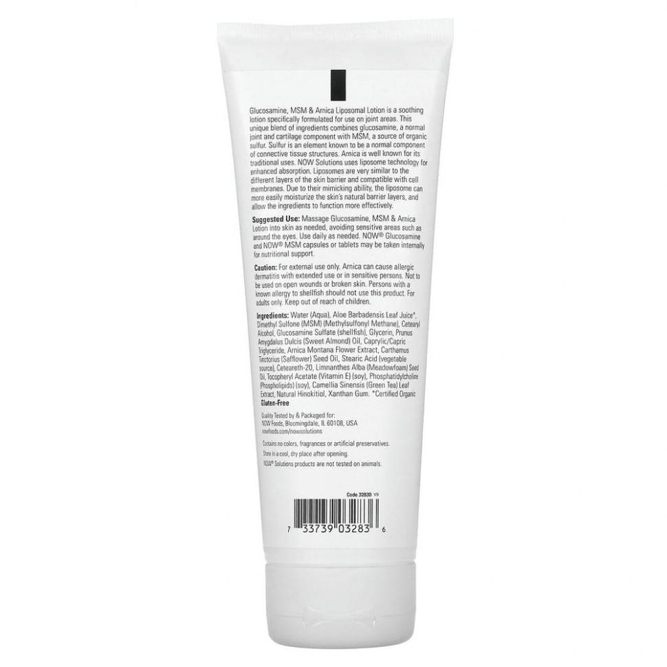 Липосомный лосьон с глюкозамином, МСМ и арникой — это успокаивающий лосьон, специально разработанный для применения в области суставов. Этот уникальный комплекс ингредиентов объединяет глюкозамин, нормальный компонент суставов и хрящей, с МСМ, источником органической серы. Сера — это элемент, который, как известно, является нормальным компонентом структур соединительной ткани. Арника хорошо известна своим традиционным применением. NOW Solutions использует липосомную технологию для повышенного всасывания. Липосомы очень похожи на разные барьерные слои кожи и совместимы с клеточными мембранами. Благодаря своей способности к имитации липосомы легко увлажняют естественные барьерные слои кожи и позволяют ингредиентам функционировать более эффективно.