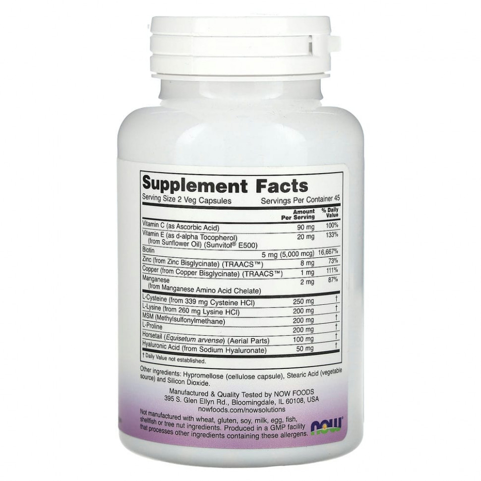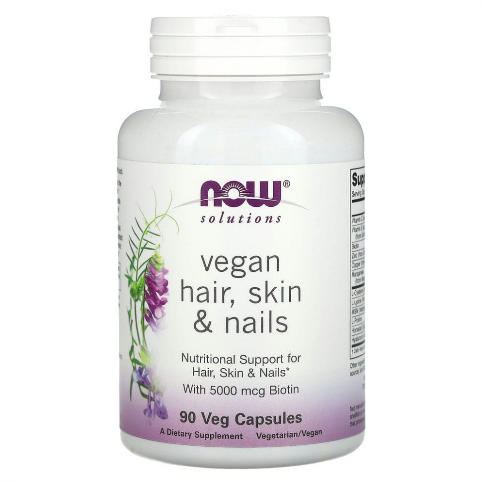 Добавка для здоровья волос, кожи и ногтей от NOW ® Solutions работает на клеточном уровне, помогая поддержать естественную красоту изнутри. Эта полностью веганская формула содержит аминокислоты и микроэлементы, которые необходимы для выработки коллагена и кератина — основных структурных компонентов волос, кожи и ногтей. Кроме того, в состав включены антиоксидантные витамины C и E, помогающие защитить кожу от свободных радикалов, а также биотин и гиалуроновая кислота, которые поддерживают здоровье и молодость кожи.