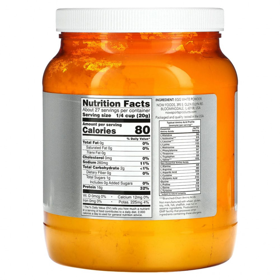 Протеин из яичного белка от NOW® Sports — это отличный натуральный источник высококачественного белка. Качество белков определяют по шкале аминокислот с поправкой на усвояемость белка (PDCAAS). Этот метод позволяет наиболее точно оценить их качество. По шкале PDCAAS протеин из яичного белка от NOW® Sports считается белком высочайшего качества. Хорошее сочетание белков из разных источников обеспечивает наилучшие результаты, а высококачественный протеин из яичного белка от NOW® Sports является отличным дополнением к любой программе, содержащей протеиновые добавки.