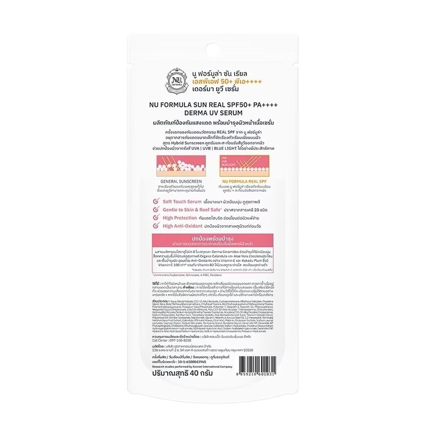 Nu Formula Sun Real SPF50+ PA++++ Derma UV Serum Sunscreen, the latest innovation for sensitive skin, sensitive to the sun. With REAL SPF 50+ PA ++++ protects the skin from all rays. UVA1 UVA2 UVB Bluelight With innovative small particle sunscreen with SPF Booster, helping sunscreen molecules align closely with the skin. Reflect all UV off the skin. Protect your skin from the sun with more confidence. derma sunscreen Serum texture, easy to spread, light, absorb quickly, comfortable skin, not greasy, ready to lock moisture for healthy skin. Finish naturally glowing skin with 8HYA and Ceramides to help protect skin from irritation easily. Free from 20 irritating chemicals, fragrance-free, alcohol-free, paraben-free, gentle, dermatologist-approved. that it does not irritate even sensitive skin — Hybrid Sunscreen absorbs and reflects all UV from the skin (Broad Spectrum 290-400 nm.) is a full protection protection. — High Anti-Oxidant (Kakaduplum) and Niacinamide protect skin from premature aging and dark spots. — Double Soothing Complex soothes the skin from the sun with Organic Calendula and Aloe Vera extracts. — Reef Safe is friendly to coral reefs. UVA1 UVA2 UVB 30 volunteers with sensitive skin (Sensitive Skin) between the ages of 26-60 from the SGS Institute. Free from Alcohol, Fragrance, Parabens, Mineral Oil, Synthetic colorant, Petrolatum, Benzophenone-4, Oxybenzone (Benzophenone-3), Octinoxate, Octocrylene, Homosalate, 4-methylbenzylidene Camphor, PABA, Steroid, Gluten, Triclosan, Hydroquinone, BHT, MCIT MIT, DMDM Hydantoin