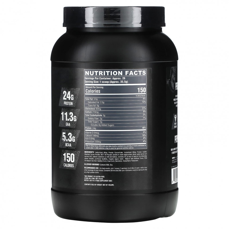 Быстрорастворимый концентрат сывороточного протеина, инстантизированный изолят сывороточного протеина подщелачиваемый какао-порошок, порошок масла mct [среднецепочечные триглицериды (из пальмовых ядер и кокосового масла), казеинат натрия (производное от молока), содержит не более 2% каждого из следующих веществ: диоксид кремния, подсолнечный лецитин]. органический инулин агавы, натуральные и искусственные ароматизаторы, розовая гималайская соль, ксантановая камедь, гуаровая камедь, сукралоза, ацесульфам калия.