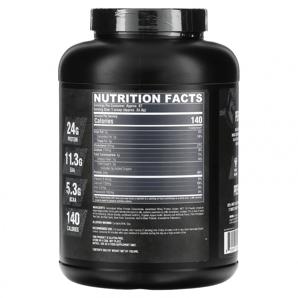 Быстрорастворимый концентрат сывороточного протеина, инстантизированный изолят сывороточного протеина, порошок масла mct [среднецепочечные триглицериды (из пальмовых ядер и кокосового масла), казеинат натрия (производное от молока), содержит не более 2% каждого из следующих веществ: диоксид кремния, лецитин подсолнечника), органический инулин агавы, натуральные и искусственные ароматизаторы, розовая гималайская соль, ксантановая камедь, гуаровая камедь, сукралоза, порошок из стручков ванили, ацесульфам калия.