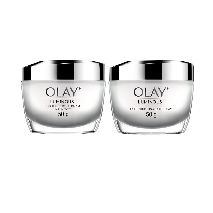 Olay Light Perfecting Day Face Cream Moisturizer Luminous Brightening Skin Care SPF 15 PA++ Olay Luminous Light Perfecting Day Cream contains Vitamin B3 that helps brighten skin tone and reduce the appearance of dark spots. With SPF 15 PA++ to protect the skin from harmful UVA/UVB rays. Formulated with Vitamin B3, Vitamin E, Pro-vitamin B5 & Vitamin P to boost skin translucency from inside out.Olay Light Perfecting Night Face Cream Moisturizer Luminous Brightening Skin Care Olay Luminous Light Perfecting Night Cream provides deep hydration throught the night. It enhances the skin renewal process, reducing appearance of dark spots and providing skin nourishment with vitamin B3 & Vitamin E to boost skin transluscency from inside out.- Niacinamide (Vitamin B3)- Sepitonik — helps brightens skin- Sepiwhite — reduce the appearance of dark spots- Xylotol — increases hydration