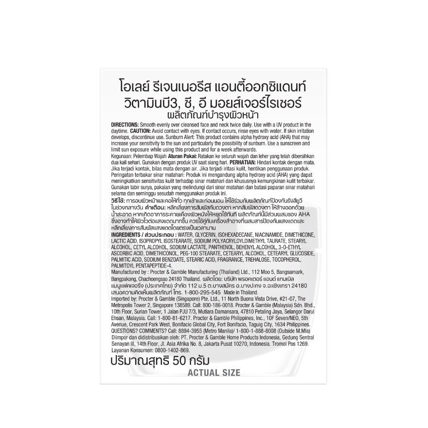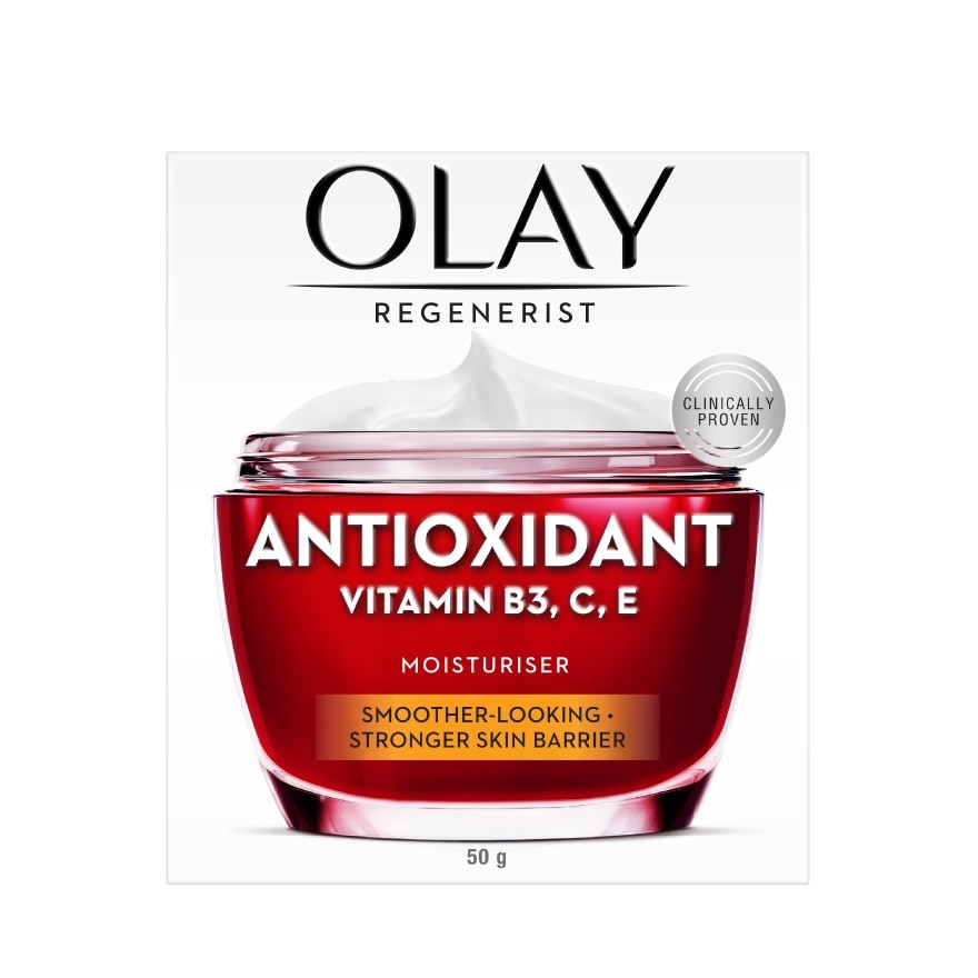 Olay Regenerist Antioxidant vitamins B3 C E Moisturiser SMOOTHER & HEALTHIER SKIN with OLAY ANTIOXIDANT MOISTURISER. Rich in antioxidants to fight early signs of aging by strengthening skin barrier. Instantly hydrates for soft and smooth skin, up to 24 hours. Visibly improves rough texture to reveal healthy and younger skin in 1 week. Non-greasy moisturiser. TECHNOLOGY. Boosted with 3 vitamins (B3 C E) to target skin cells inside and out. Protects skin from environmental stressors. Repairs & renews skin cells on surface to strengthen skin barrier strengthens skin barrier with regular use.