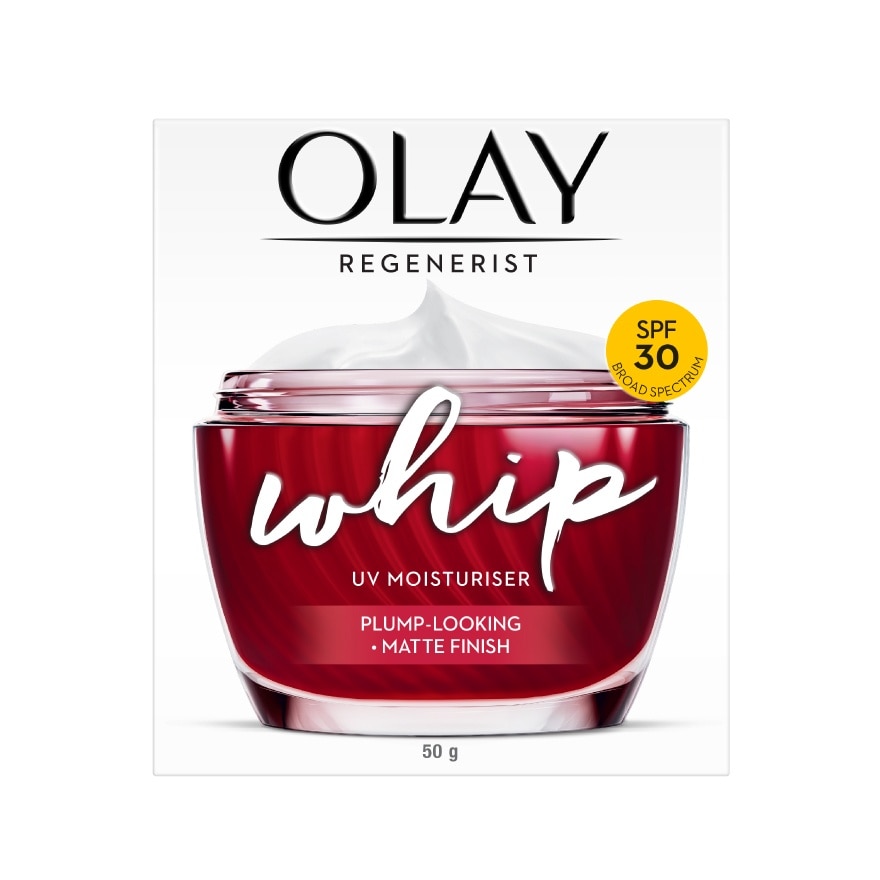 OLAY REGENERIST WHIP UV SPF30 PA+++ 50 gADVANCED ANT-AGEINGlight as ar fish all day tong- Controls shine & gives matte finish, even after 8 hours- Skin feels light & smooth all day long- Instantly hydrates & primes skin for all-day makeup wear- Active hydrates to improve elasticity and firmness- In 4 weeks, significantly reduces lines and wrinkles. TECHNOLOGY- Exclusive Active Rush Technology actively holds & releases 1000X its weight in hydration- Uniquely whipped formula, enriched with potent anti-ageing actives — ADVANCED AMINO-PEPTIDE COMPLEX + CAROB FRUIT EXTRACT- Oil-Free. Non-Greasy. Absorbs instantly. Will not clog pores.