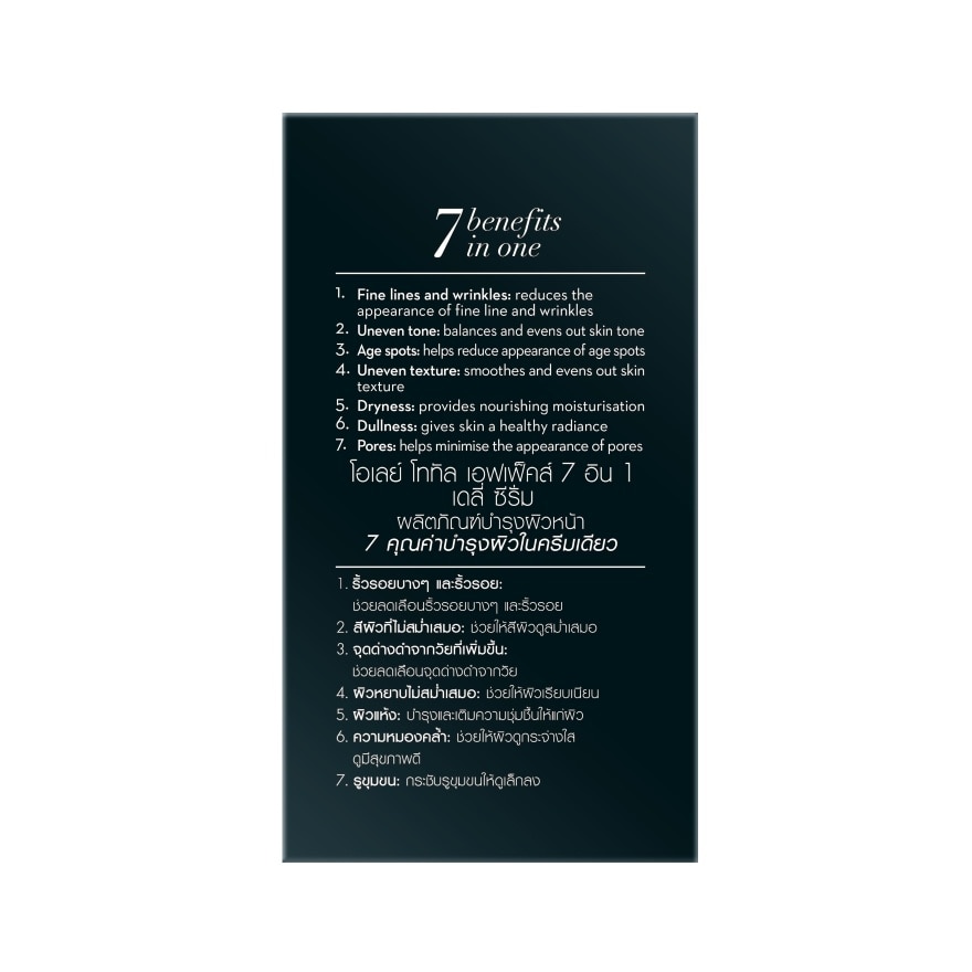 Olay Total Effect 7in1 Daily Serum Olay Totel Effects Daily Serum with concentrated formula of 4% more of VitaNiacin to fight 7 signs of ageing: 1. Fine lines and wrinkles: reduces the appearance of fine line and wrinkles 2. Uneven tone: balances and evens out skin tone 3. Age spots: reduces appearance of age spots 4. Uneven texture: smoothes and evens out skin texture 5. Dryness: provides nourishing moisturisation 6. Dullness: gives skin a healthy radiance 7. Pores: minimizes the appearance of pores. Smooth evenly over cleansed face and neck, morning and night. Use with a UV product in the daytime. avoid contact with eyes.