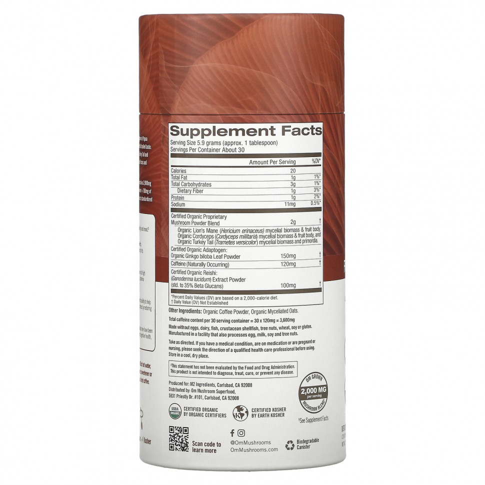 Каждая порция кофейной смеси с грибами Ом содержит 2000 мг сертифицированного органического порошка из цельных грибов + 100 мг запатентованного органического экстракта цельных продуктов рейши (0 мг), стандартизированного до 35% бета-глюканов.