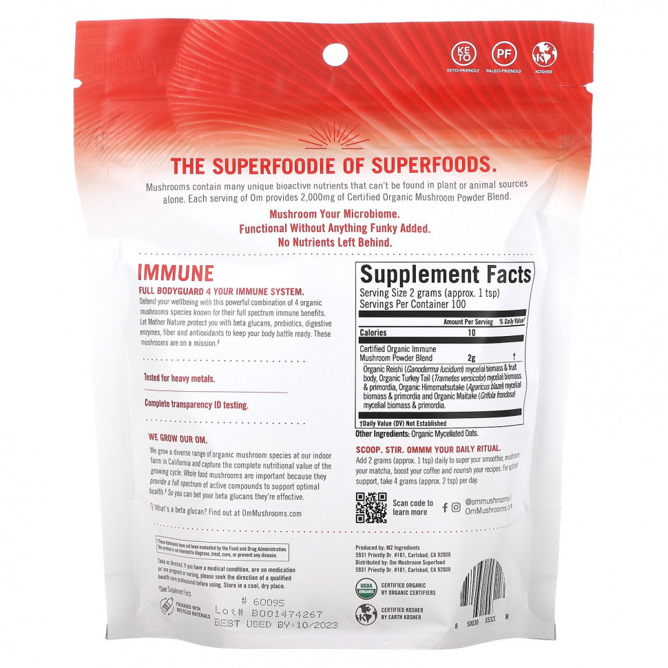 Грибы содержат множество уникальных биоактивных питательных веществ, которые невозможно найти только в растительных или животных источниках. Каждая порция Om содержит 2000 мг смеси сертифицированных органических грибов.